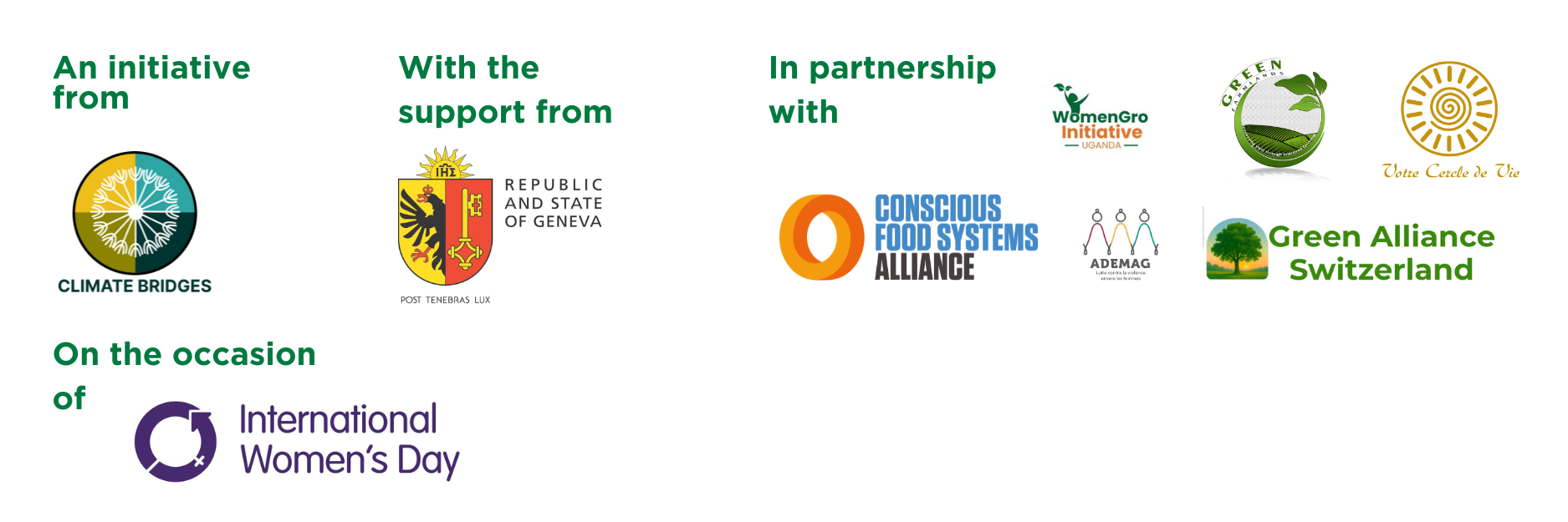 On the occasion of International Women’s Day 2026, the International Year of Women Farmers, and the launch of the Conscious Food Systems Alliance Switzerland Hub, Climate Bridges warmly invites you to a full day of events, including a formal UN consultation of food systems (registration for this will be shared separately), the Annual General Assembly and an Open Forum including a series of dialogues, circles of trust, mindfulness sessions and an evening public conference to celebrate our global community of climate leaders and highlight the role of women as change-makers transforming food systems. Following the insightful discussions, you are also invited to share food and drinks during an apéro dinatoire, to connect from heart to heart and continue the conversation with other participants at an interpersonal level.
